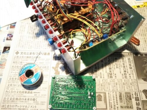 とある高校のクイズ研究同好会に寄付した早押し機が故障したとのこと。 修理のため引き取ってきました。 故障内容は、 押しボタン子機8つのうち2つの押しボタンが反応しない。 それとは別の1つのLEDが点灯しない。 ということでした。 故障箇所の特定作業。 …